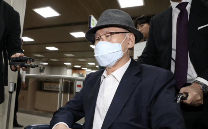 지난달 병원에 입원했다는 김 전 기획관은 회색 모자와 마스크를 쓴 채 아들이 밀어주는 휠체어를 타고 법정에 들어섰다.