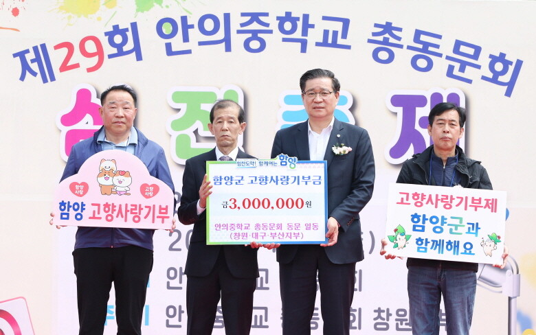함양 안의중학교 총동문회(회장 박윤수)는 지난 19일 안의중학교 운동장에서 열린 '제29회 총동문회(심진축제)' 개회식에서 진병영 군수에 고향사랑기부금 300만원을 기탁했다.