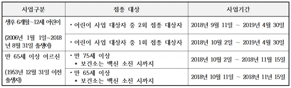 ▲ 2018-2019 독감 국가예방접종 지원사업 대상자별 사업기간 현황. [질병관리본부 제공]