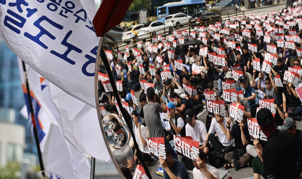 | ▲ 철도노조 총파업 출정식이 길가 볼록거울에 비치고 있다. [이상훈 선임기자] |