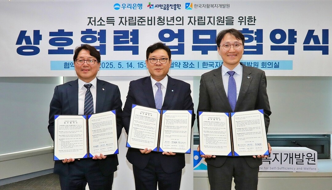 우리은행은 지난 14일 서울 서대문구 한국자활복지개발원 본원에서 서민금융진흥원, 한국자활복지개발원과 '취약청년 자립지원을 위한 업무협약'을 체결했다고 15일 밝혔다.