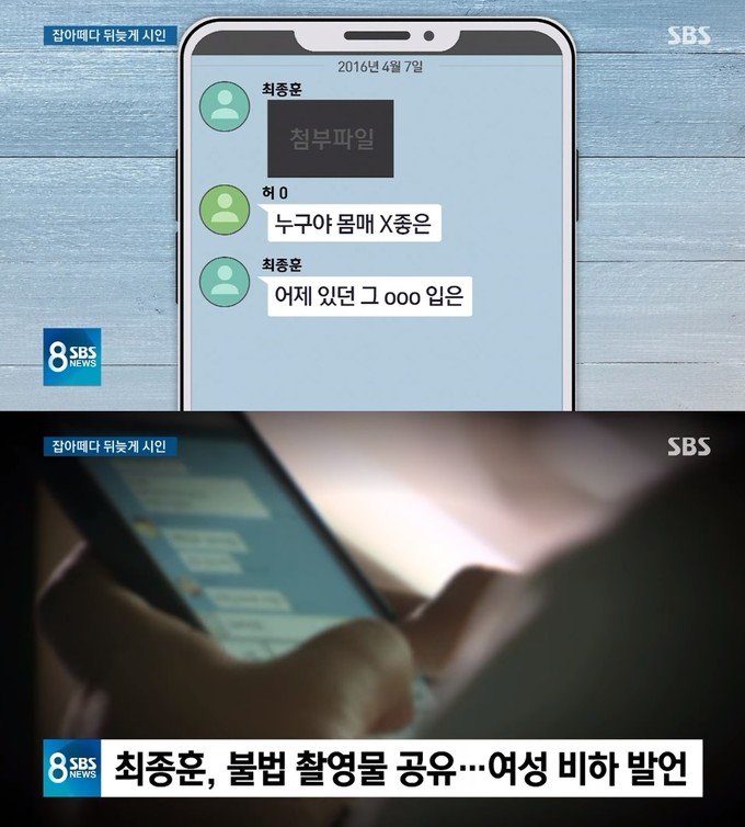 아울러 최종훈은 대화방에서 여성의 몸을 찍은 사진을 보여달라 재촉하거나 여성 비하 발언을 반복했고 대화방에 올라온 성관계 동영상도 봤다.