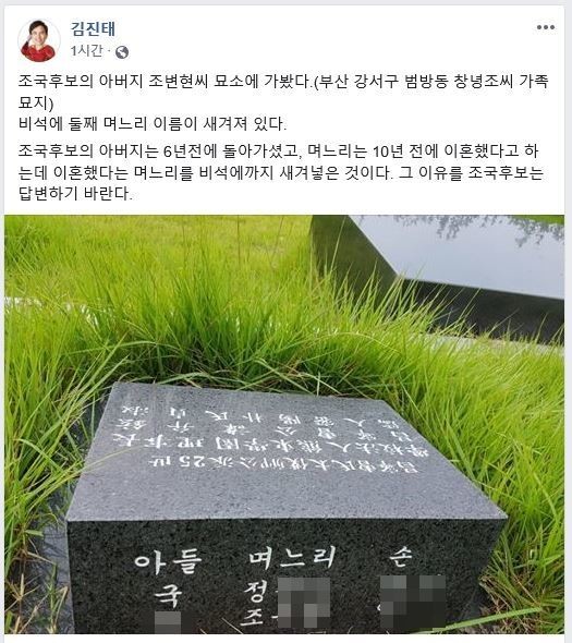 앞서 지난 20일 김진태 자유한국당 의원은 조 후보자의 부친 묘비를 찾아 이혼한 지 4년 된 동생의 전처 조모 씨 이름이 새겨진 것을 확인하고 왔다며 비석 사진을 공개했다.