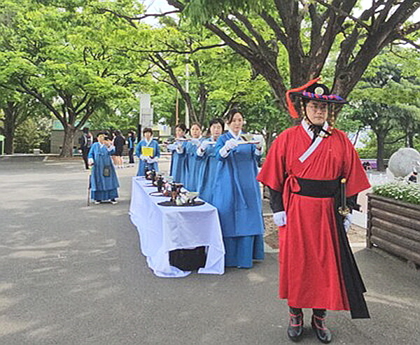 ▲ 28일 용두산공원 이순신 장군 동상 앞에서 '여해다풍 헌다례' 행사가 열리고 있다. [최재호 기자]