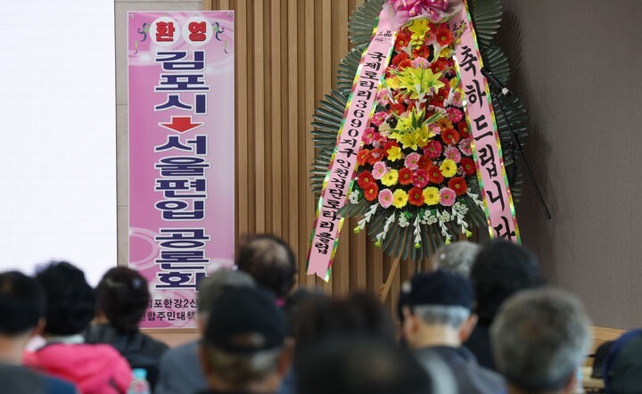 | ▲ 4일 경기 김포농협에서 김포한강2신도시 주민 설명회 및 창립총회가 열리고 있다. 무대에 '환영 김포시 서울 편입 공론화' 입간판이 설치돼 있다. [뉴시스] |