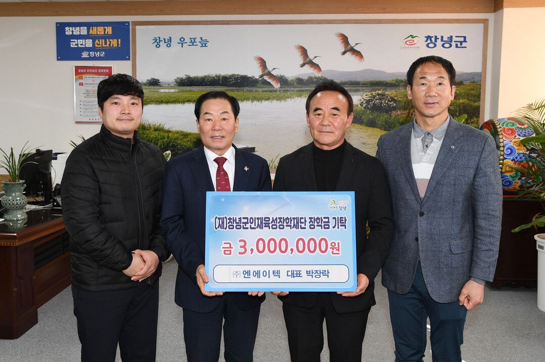 경남 창녕군은 ㈜엔에이텍 박장락 대표가 지난 4일 인재육성장학재단에 기금 300만 원을 기탁했다고 7일 밝혔다.