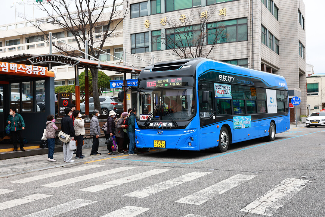 | ▲ 시민들이 울진군의회 앞 버스정류장에서 경북 울진군에서 운영하는 현대 일렉시티 전기 버스를 타고 있다. [울진군 제공] |