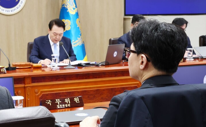 | ▲ 한동훈 법무부 장관이 19일 서울 용산 대통령실에서 열린 국무회의에서 윤석열 대통령 발언을 듣고 있다. [뉴시스] |