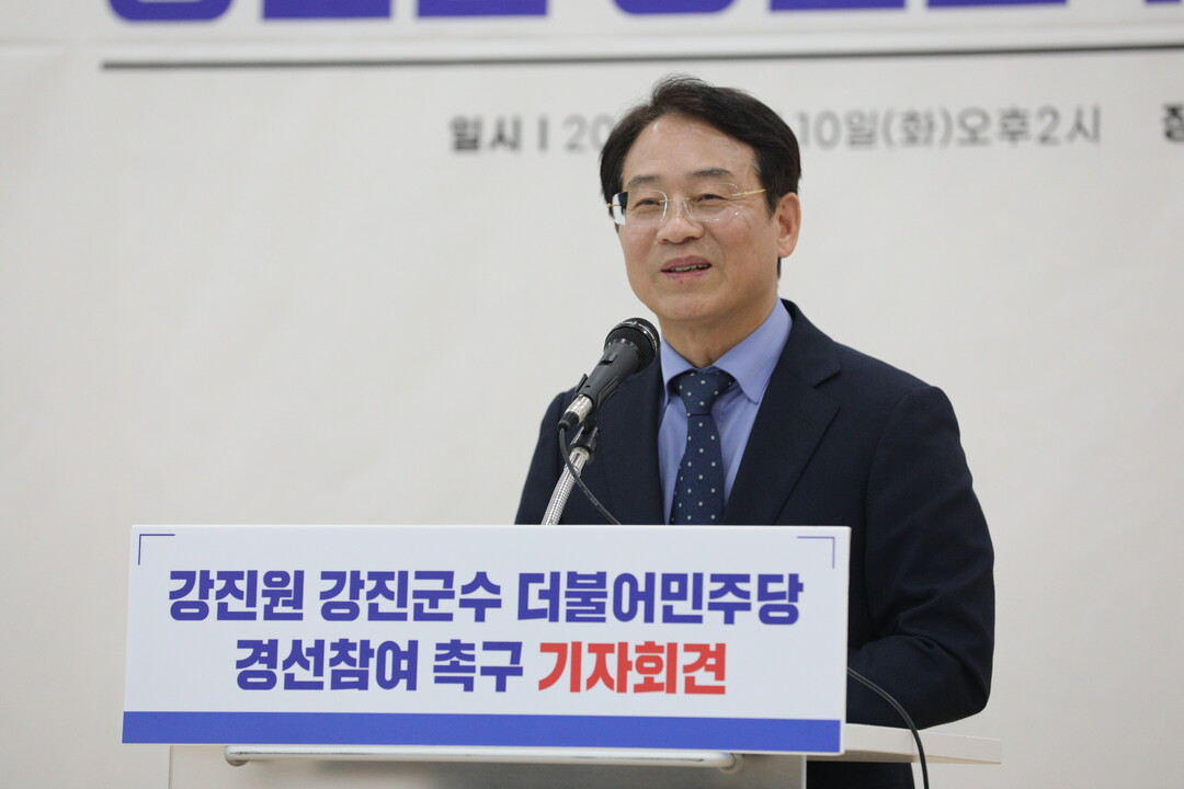 ▲ 강진원 강진군수가 10일 웰니스푸소센터에서 더불어민주당 경선참여를 촉구하는 기자회견을 갖고 있다. [강성명 기자]