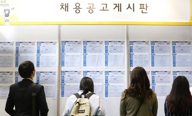 ▲ 지난 4일 서울 성북구 성신여자대학교 체육관에서 열린 2018 정보보호 취업박람회를 찾은 구직 희망자들이 채용공고 게시판을 살펴보고 있다. [뉴시스]