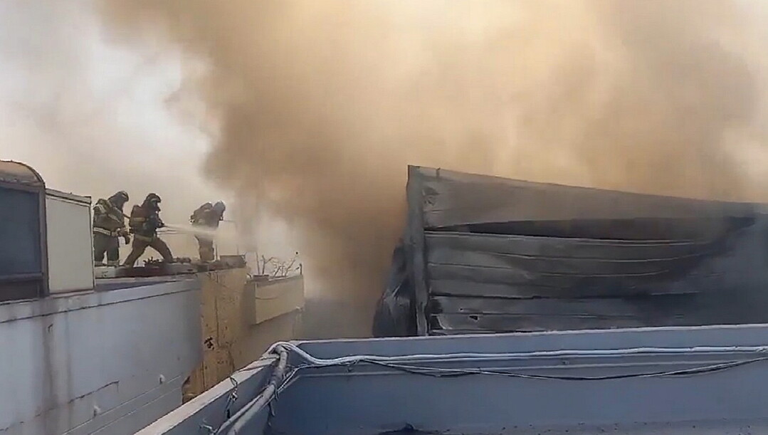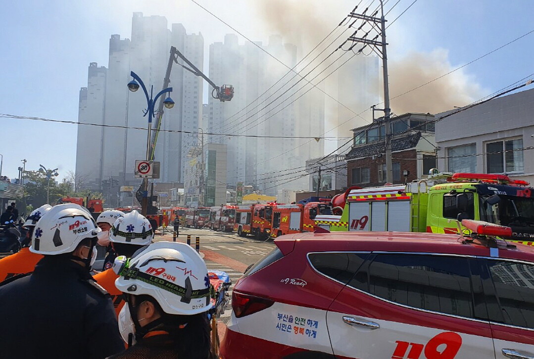 | ▲ 14일 낮 부산 장전동 마트 화재 현장에서 소방대원이 불을 끄고 있는 모습 [부산소방재난본부 제공] |