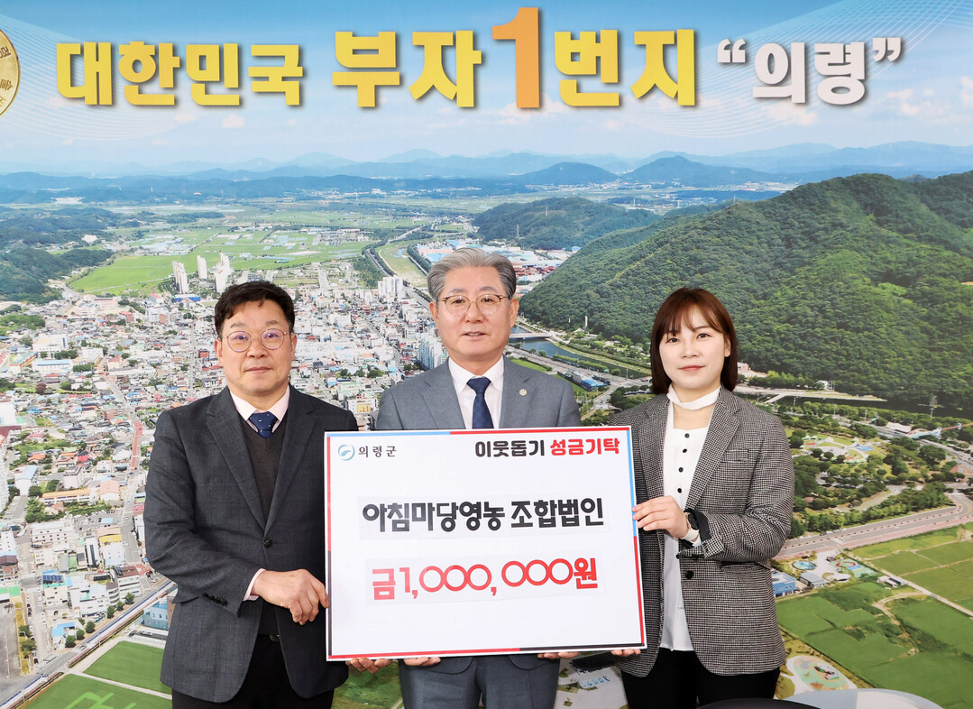 의령군 대의면 소재 아침마당영농조합법인(대표 전길식)은 지난 5일 군청을 방문해 이웃돕기 후원금 100만원을 오태완 군수에 기탁했다.