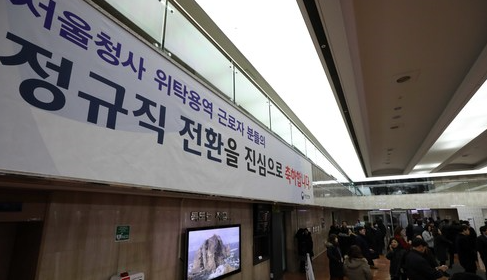 ▲ 지난 1월 3일 서울 종로구 정부서울청사 1층 로비에 '서울청사 위탁용역 근로자의 정규직 전환을 진심으로 축하'한다는 행정안전부의 현수막이 걸려 있다. [뉴시스]