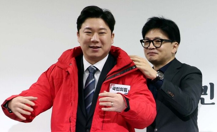 | ▲ 국민의힘 한동훈 비대위원장이 5일 서울 여의도 중앙당사에서 열린 영입인재 환영식에서 진종오 전 사격 국가대표에게 당 점퍼를 입혀주고 있다. [뉴시스] |