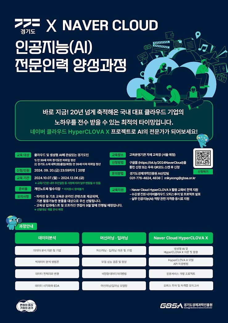 경기도와 경기도경제과학진흥원(GBSA)은 네이버클라우드와 협력해 '네이버클라우드 인공지능(AI) 전문인력 양성과정'을 운영한다고 13일 밝혔다.