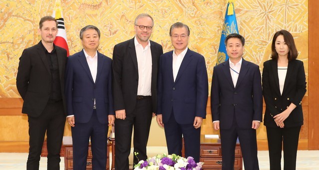 ▲ 문재인 대통령이 18일 청와대 본관에서 크리스토프 들루아르 국경없는기자회 사무총장과 만나 기념촬영하고 있다. 왼쪽부터 세드릭 알비아니 동아시아 지부장, 정규성 한국기자협회장, 들루아르 사무총장, 문 대통령, 윤도한 국민소통수석. [뉴시스]