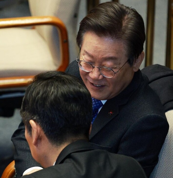 | ▲ 더불어민주당 이재명 대표가 22일 국회 본회의 정치·외교·통일·안보·교육·사회·문화 대정부 질문에서 정청래 최고위원과 대화하며 웃고 있다. [뉴시스] |