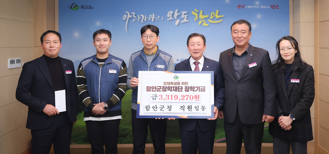 전국공무원노동조합 경남 함안군지부(지부장 조주환)는 22일 지난해 직원 급여 자투리로 모은 331만9270원을 장학재단에 기탁했다.
