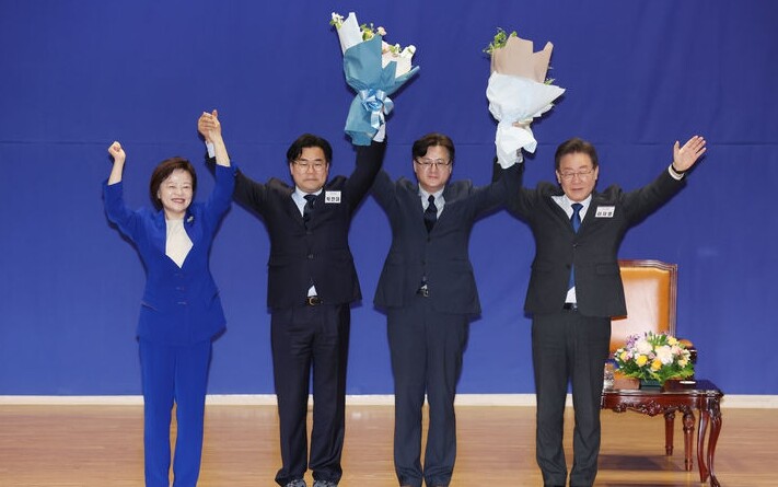 ▲ 더불어민주당 이재명 대표가 3일 국회 의원회관에서 열린 원내대표 선출 당선인 총회에서 전·현 원내대표 등과 함께 기념촬영을 하고 있다. 왼쪽 두번째부터 박찬대 신임 원내대표, 홍익표 전 원내대표, 이 대표. [뉴시스]
