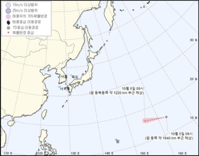 5일 기상청에 따르면 이날 오전 3시 괌 동쪽 2010km 부근 해상에서 열대저압부가 발생했다.