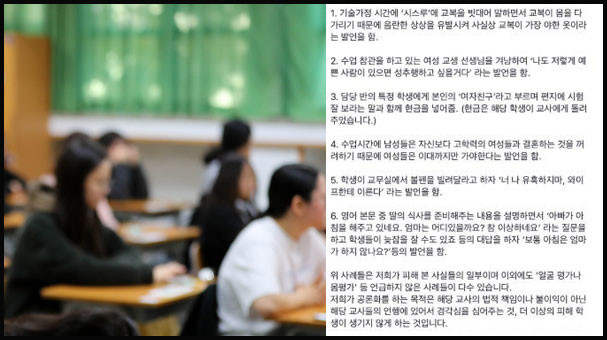 댓글 등에 따르면 A여고 한 교사는 '교복이 몸을 다 가리기 때문에 음란한 상상을 유발해 사실상 가장 야한 옷'이라는 등의 성희롱 발언을 했다.