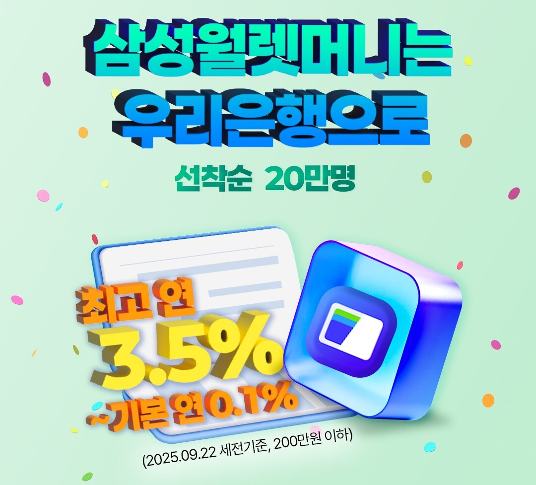 아울러 '삼성월렛머니 우리통장'과 '삼성월렛머니 우리적금' 동시 가입자 중 100명을 추첨해 삼성 갤럭시 폴드7, 플립7, 풀트라 워치 등을 증정한다.