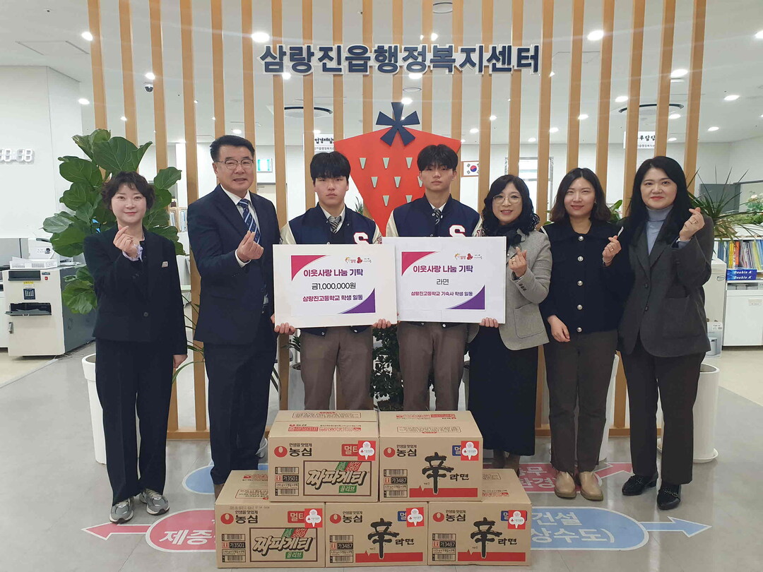 밀양시 삼랑진읍은 12일 삼랑진고등학교에서 성금 100만원과 라면 5박스를 행정복지센터에 기탁했다고 밝혔다.