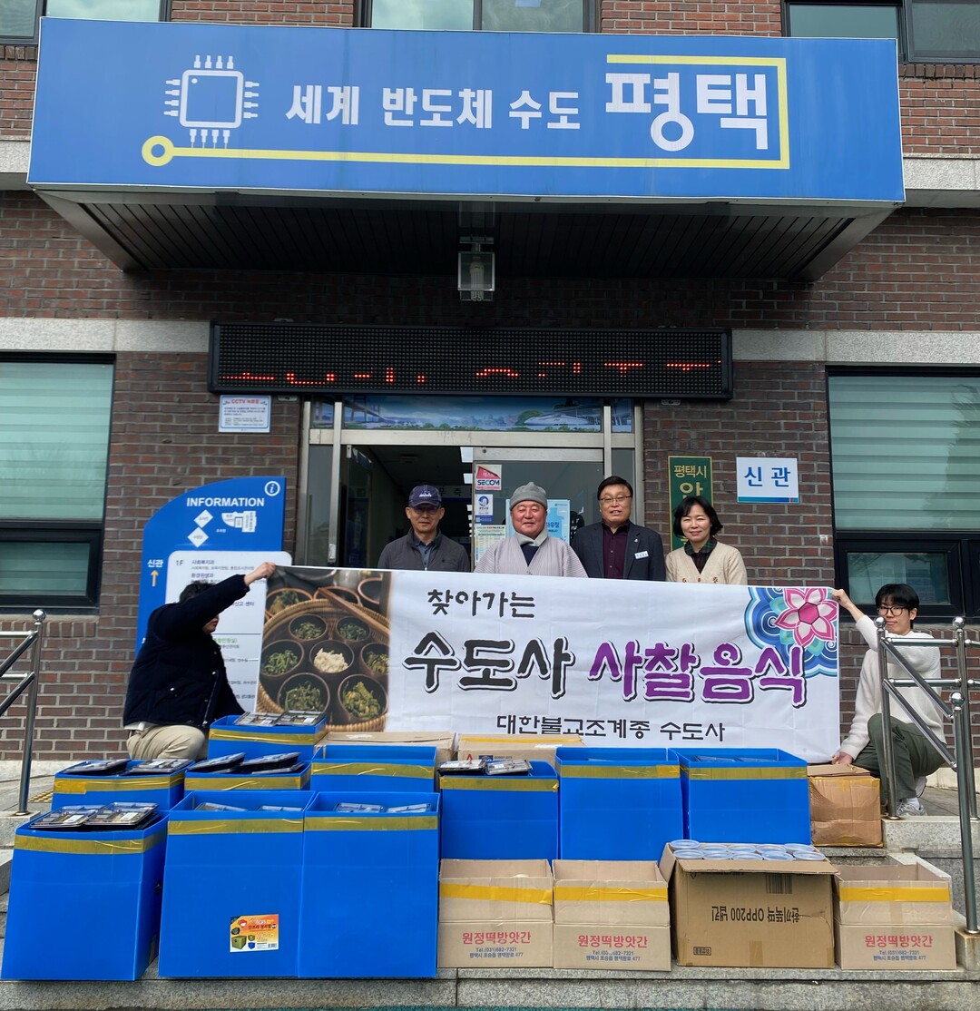 | ▲ 18일 평택시 수도사 주지 적문스님(왼쪽 2번째)이 안중출장소에 사찰음식 도시락을 전달한 뒤 기념촬영을 하고 있다. [평택시 제공] |