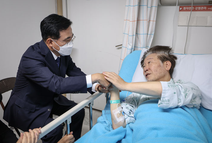 | ▲ 더불어민주당 이재명 대표가 지난 22일 서울 중랑구 녹색병원을 찾은 진교훈 강서구청장 후보의 손을 잡고 얘기를 나누고 있다. [민주당 제공] |