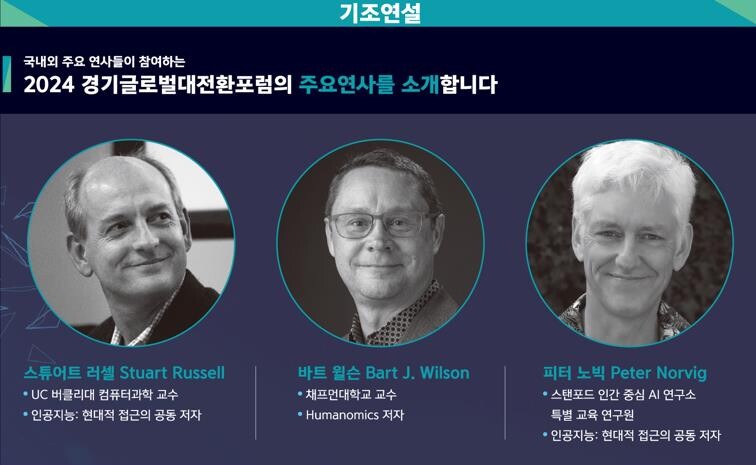 인공지능(AI)과 휴머노믹스가 우리의 미래에 어떤 기회를 제공할 수 있을지 세계적 석학과 논의하는 '2024 경기글로벌대전환포럼'이 오는 24일과 25일 양일간 고양 킨텍스에서 열린다.