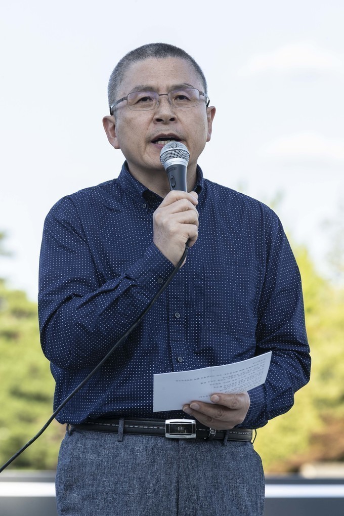 ▲ 자유한국당 황교안 대표가 지난달 16일 오후 서울 종로구 청와대 앞 분수대광장에서 '문재인 정권의 헌정유린 중단과 조국 파면 촉구' 삭발식을 마치고 발언 하고 있다. [문재원 기자]