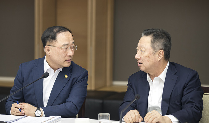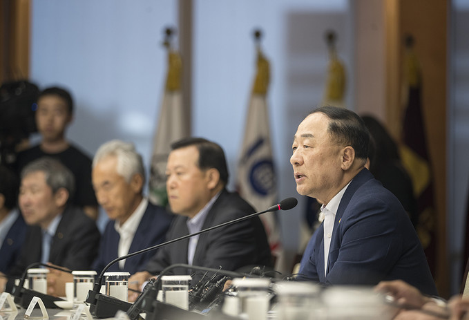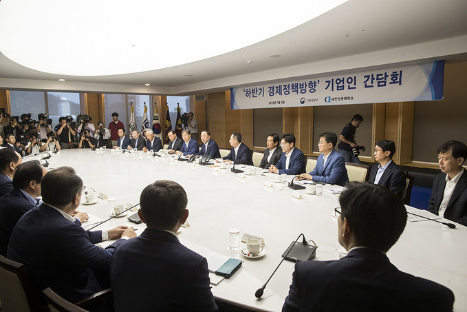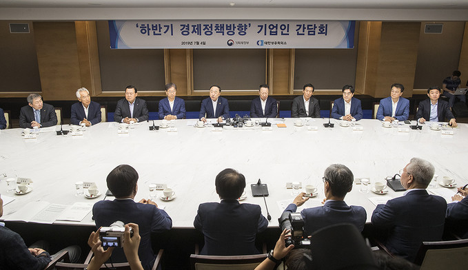 홍남기 경제부총리 겸 기획재정부 장관과 박용만 대한상의 회장이 4일 오후 서울 중구 대한상공회의소에서 열린 하반기 경제정책방향 기업인 간담회에서 대화를 나누고 있다.