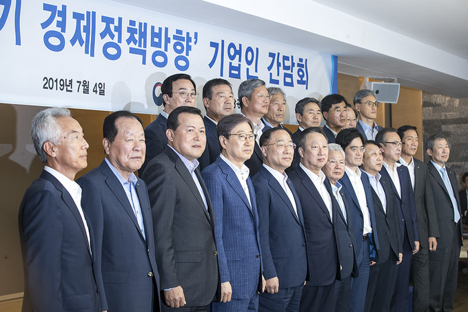 홍남기 경제부총리 겸 기획재정부 장관이 4일 오후 서울 중구 대한상공회의소에서 열린 하반기 경제정책방향 기업인 간담회에서 박용만 대한상의 회장을 비롯한 기업인 및 대한상의 회장단과 기념촬영을 하고 있다.