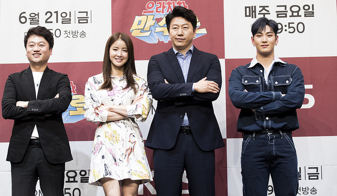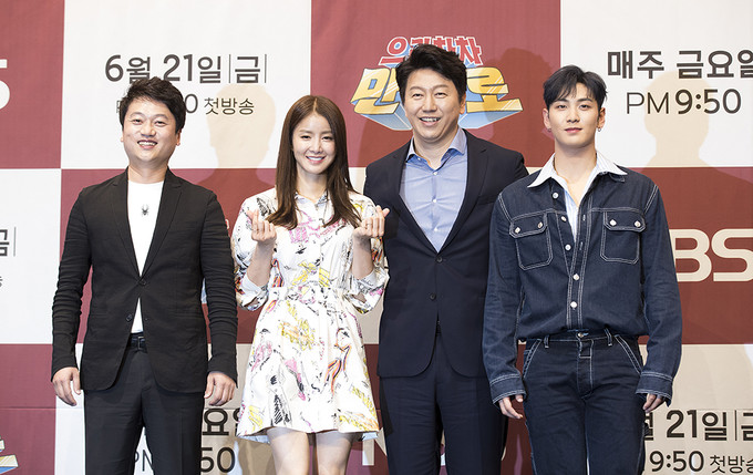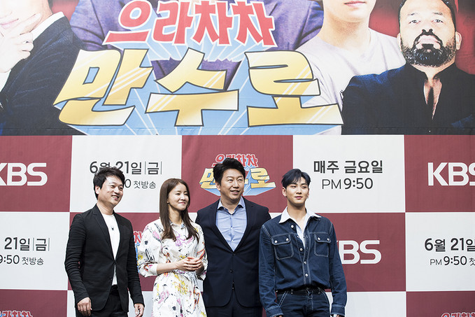 으라차차 만수로 출연진들이 21일 서울 구로구 라마다 서울 신도림호텔에서 열린 KBS 2TV 새 예능프로그램 '으라차차 만수로'(CP 이민호, 연출 양혁) 제작발표회에서 포즈를 취하고 있다. 왼쪽부터 박문성 축구 해설가, 배우 이시영, 배우 김수로, 그룹 뉴이스트 멤버 백호.