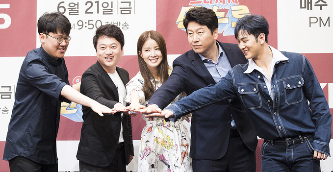 으라차차 만수로 출연진들이 21일 서울 구로구 라마다 서울 신도림호텔에서 열린 KBS 2TV 새 예능프로그램 '으라차차 만수로'(CP 이민호, 연출 양혁) 제작발표회에서 포즈를 취하고 있다. 왼쪽부터 양혁 연출, 박문성 축구 해설가, 배우 이시영, 배우 김수로, 그룹 뉴이스트 멤버 백호.