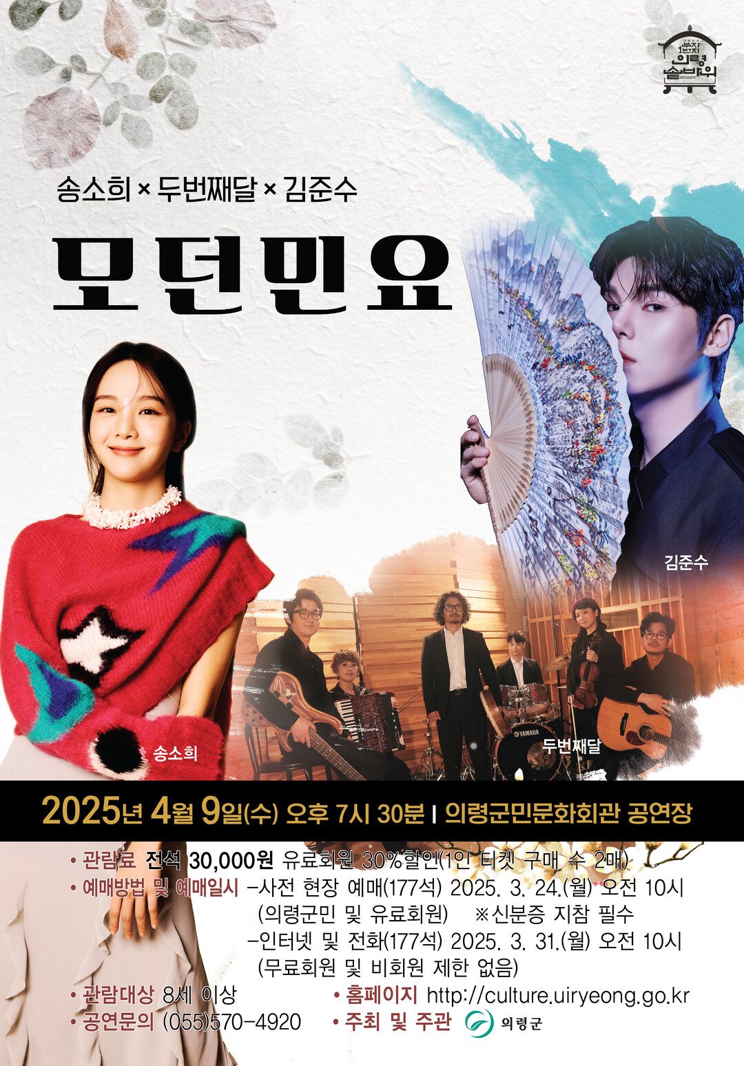 경남 의령군 자체 기획공연 '송소희×두번째달×김준수 모던민요' 가 4월 9일 오후 7시 30분 군민문화회관 공연장 무대에 오른다.