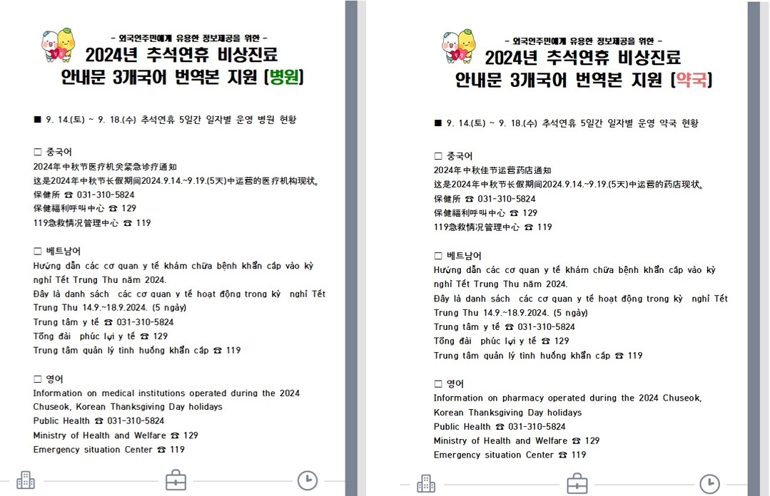 | ▲ 추석 연휴 비상 진료 병원·약국 정보를 3개 국어로 번역한 홍보물. [시흥시 제공] |