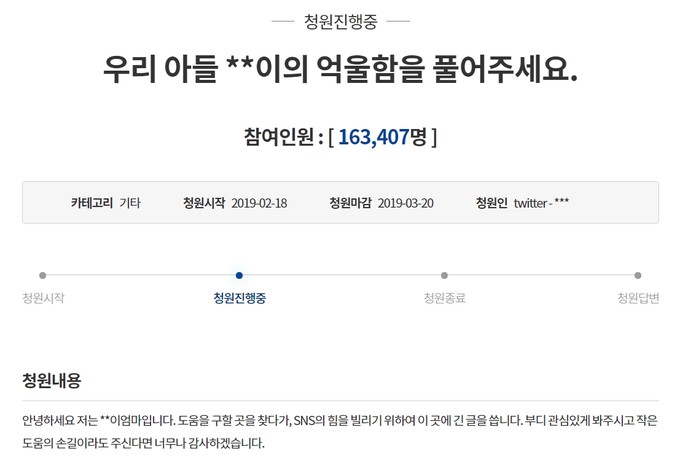 앞서 지난 18일 청와대 국민청원 및 제안 게시판에는 '우리 아들 **이의 억울함을 풀어주세요'라는 제목의 청원글이 올라왔다.
