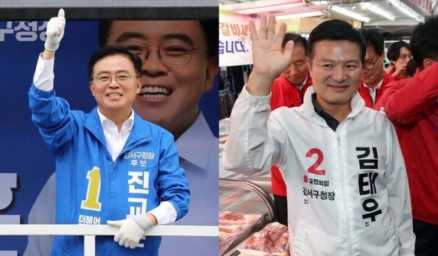 ▲ 서울 강서구청장 보궐선거에 출마한 더불어민주당 진교훈, 국민의힘 김태우 후보가 지난 8일 각각 강서구 등촌사거리와 남부시장에서 선거 유세를 하고 있다. [뉴시스] |