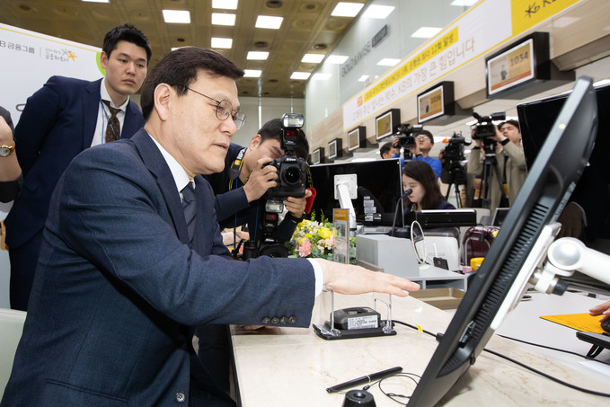 최종구 금융위원장은 지난 12일 KB국민은행 여의도 본사에 열린 출시 기념식에 참석해 서비스를 직접 시연했다. 손바닥 정보를 사전 등록한 최 위원장은 기념식이 끝난 뒤 창구에서 정맥 인증을 통해 1만원을 출금했다.