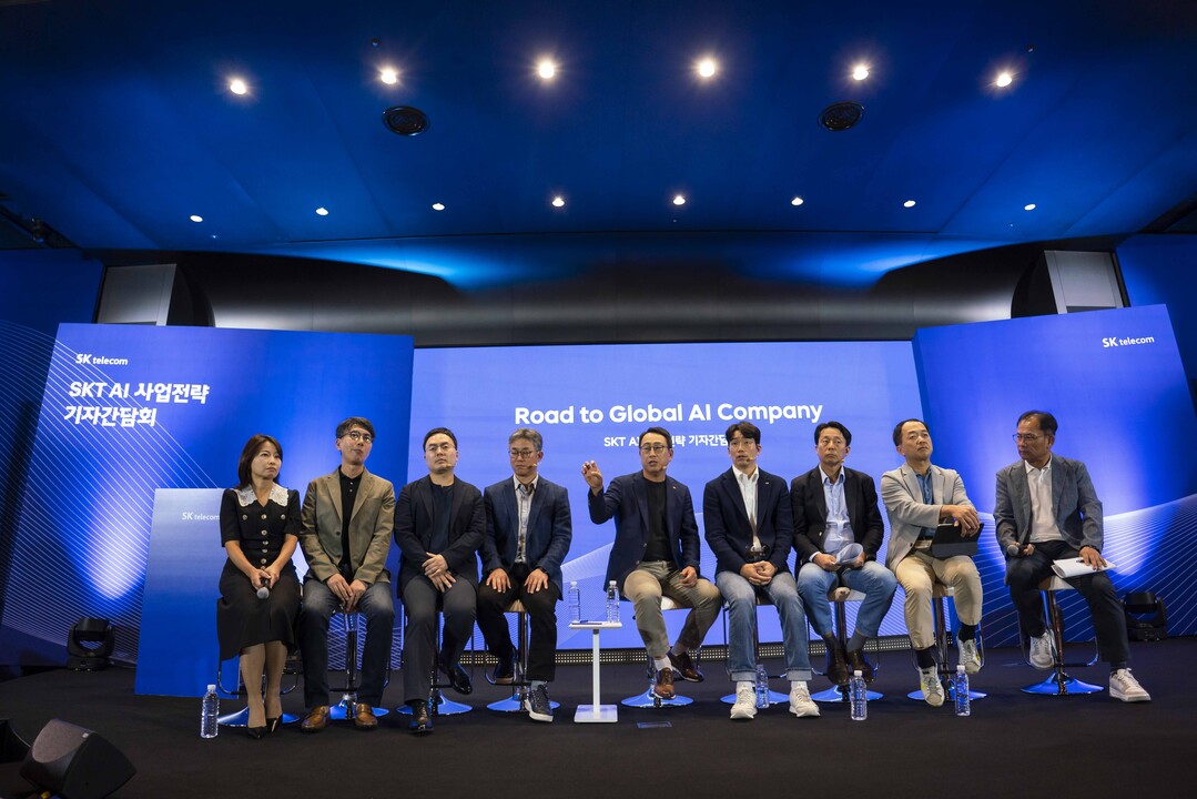▲ SK텔레콤 AI 사업전략 기자간담회 참석자들이 Q&A를 진행하는 모습. (왼쪽부터) 류수정 사피온 대표, SK브로드밴드 최성균 DC CO담당, SK텔레콤 김지원 대화 담당, 정석근 글로벌/AITech 사업부장, 유영상 사장(가운데), 김용훈 AI서비스사업부장, 김경덕 엔터프라이즈 CIC장, 한명진 최고전략책임자, 하민용 최고사업개발책임자 [SK텔레콤 제공]