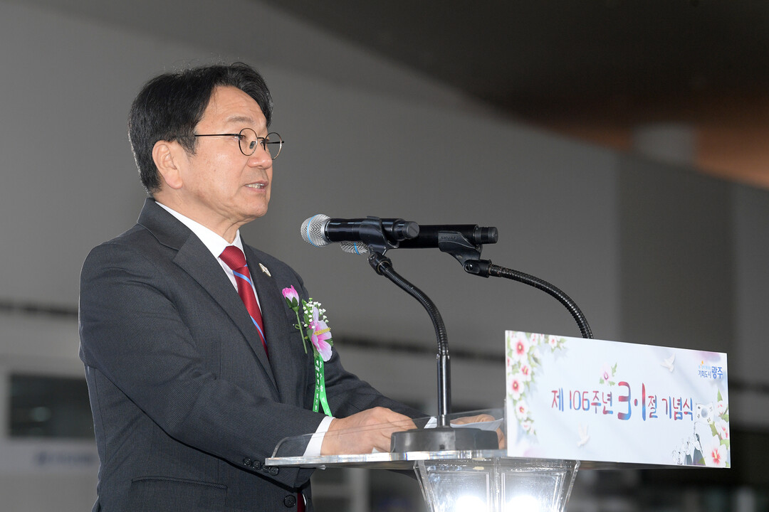 ▲ 강기정 광주광역시장이 1일 오전 시청 시민홀에서 열린 제106주년 3·1절 기념식에 참석해 '신독립선언 더 단단한 민주주의'를 주제로 기념사를 하고 있다. [광주광역시 제공]