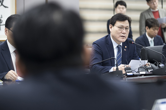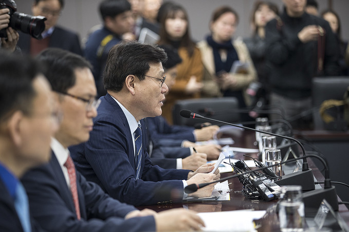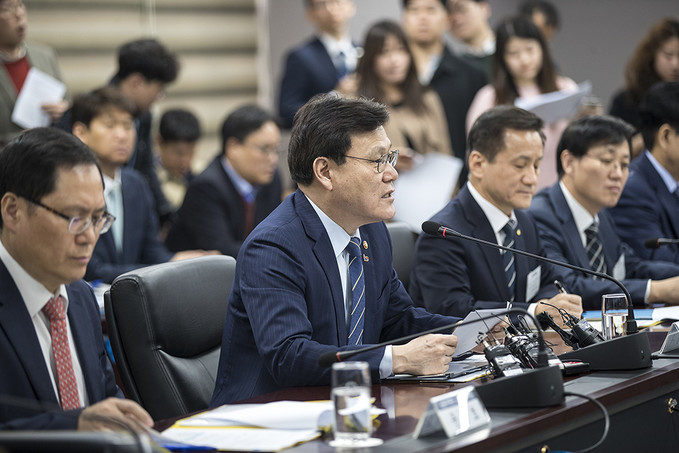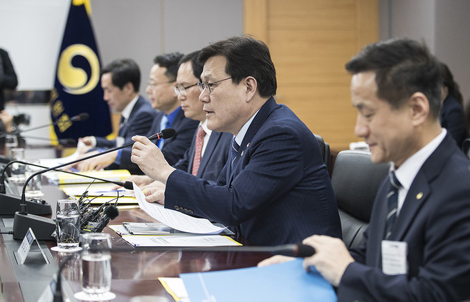 최종구 금융위원장이 9일 오후 서울 종로구 정부서울청사에서 열린 카드산업 경쟁력 제고 및 고비용 영업구조 개선방안 논의를 위한 카드사 CEO 간담회에서 모두발언을 하고 있다.