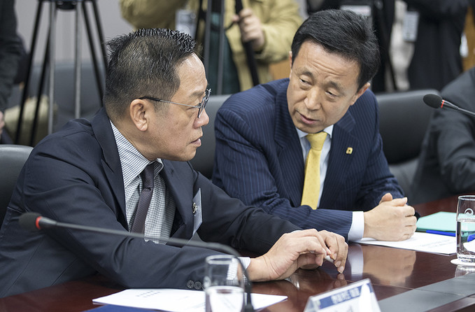 정태영(왼쪽) 현대카드 대표와 김덕수 여신금융협회 회장이 9일 오후 서울 종로구 정부서울청사에서 열린 카드산업 경쟁력 제고 및 고비용 영업구조 개선방안 논의를 위한 카드사 CEO 간담회에서 대화를 하고 있다.