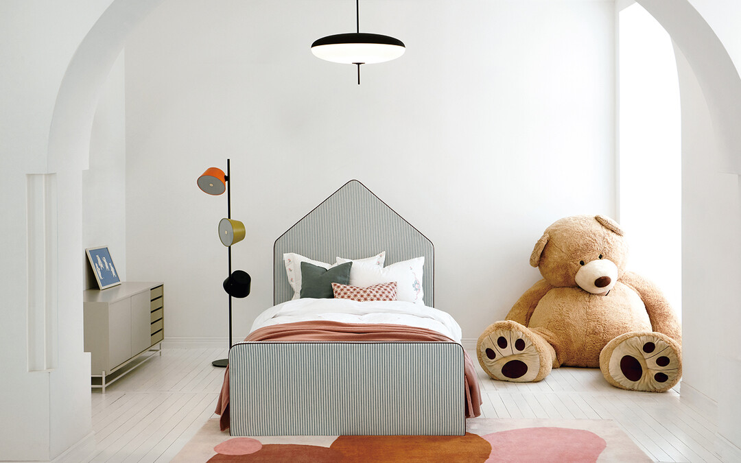 도미크는 높은 지붕 형태의 헤드 보드가 아이의 상상력을 더하는 슈퍼싱글(SS) 전용 프레임이다. 레트로 무드의 스트라이프 패턴과 화사한 컬러가 침실에 발랄함을 더한다.