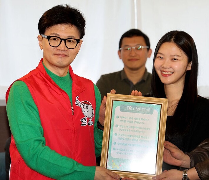 ▲ 국민의힘 한동훈 비대위원장(왼쪽)이 27일 서울 성동구의 한 북카페에서 기후 미래 스타트업 창업자들에게 '기후 미래 택배'를 전달한 후 기념촬영을 하고 있다. [뉴시스]