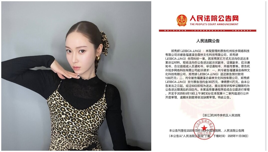 14일 중국 최대 포털 신랑망(新浪網)을 비롯한 중화권 다수 매체에 따르면 중국 저장성 항저우시 여항구 인민법원은 지난 3월 18일 제시카를 피고로 하는 계약 분쟁 사건의 공시송달 문서를 지난 3월 법원 공고망에 게시했다.