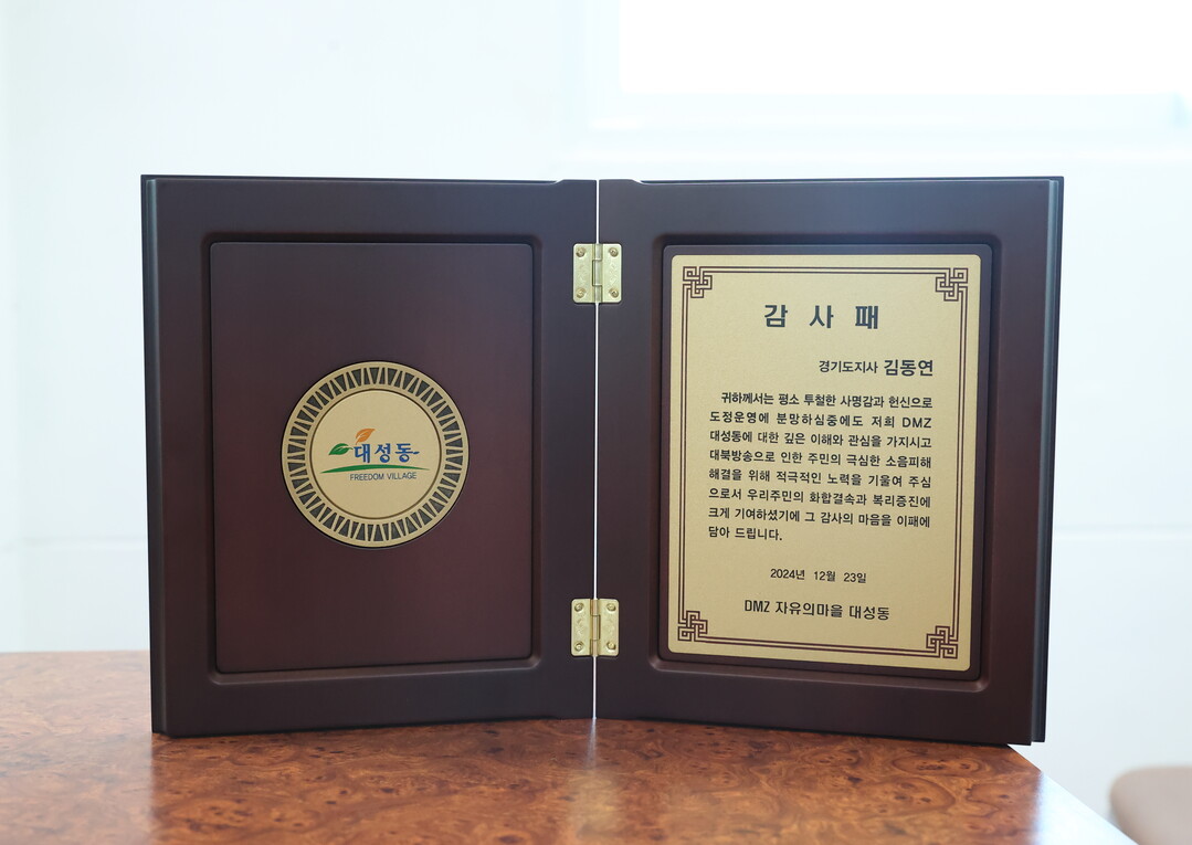 마을 이장은 대성동 주민의 마음을 모은 감사패를 김 지사에게 전했다.