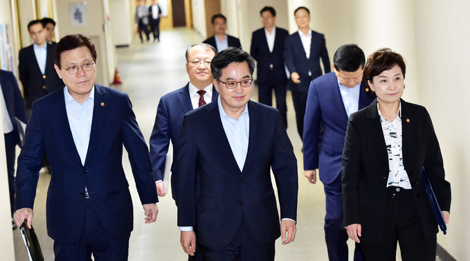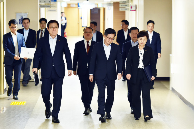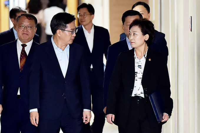 김동연 부총리 겸 기획재정부 장관과 김현미 국토교통부 장관 등 관계부처 장관들이 13일 오후 서울 세종로 정부서울청사에서 열린 주택시장 안정대책 관련 관계부처 합동브리핑에 참석하기 위해 입장하고 있다.