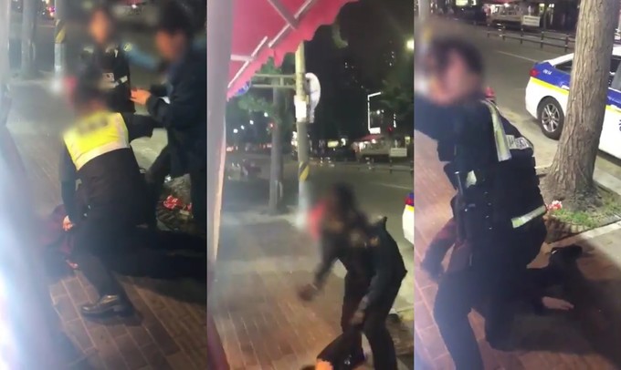 해당 영상에서는 남성 경찰관이 제압에 방해받아 끌려가자 여성 경찰관이 쓰러져 있는 취객을 제압하려 하지만 취객의 발버둥에 어쩔 줄 몰라했다. 이어 여성 경찰관은 무전으로 지원을 요청했다. 이어 제압이 여의치 않자 "힘들어 씨"라고 혼잣말 한 뒤 음식점 안 쪽으로 손짓을 하며 "남자분 하나 나오세요. 빨리 빨리 빨리 빨리. 남자분 나오시라고요. 빨리"라고 다급하게 외쳤다.
